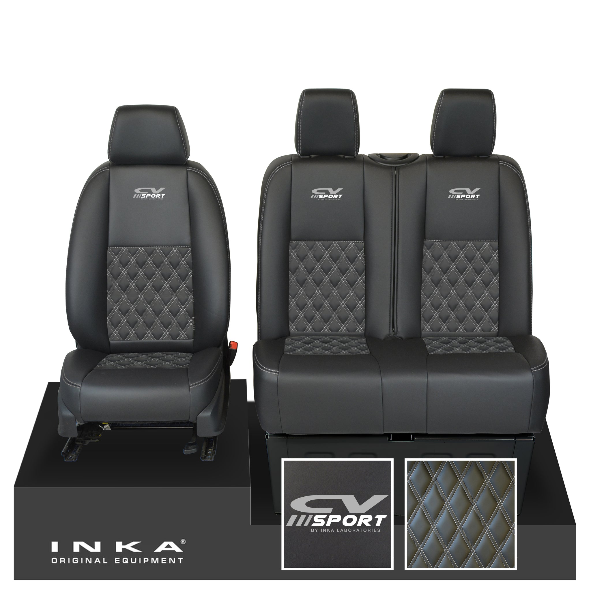 : This Item Can Be returnedMERCEDES SPRINTER-(All derivatives)-Model Year 2018 Onwards - PERFORMA Leatherette Second Skin - Front 1+2 Tailored Seat Covers-With Headrests & Armrests - Performa Center Panel With Double Diamond Bentley Stitch - Smooth Black Vinyl Outers & Decorative Stitch - With CV SPORT EMB On Two Outer Seats
