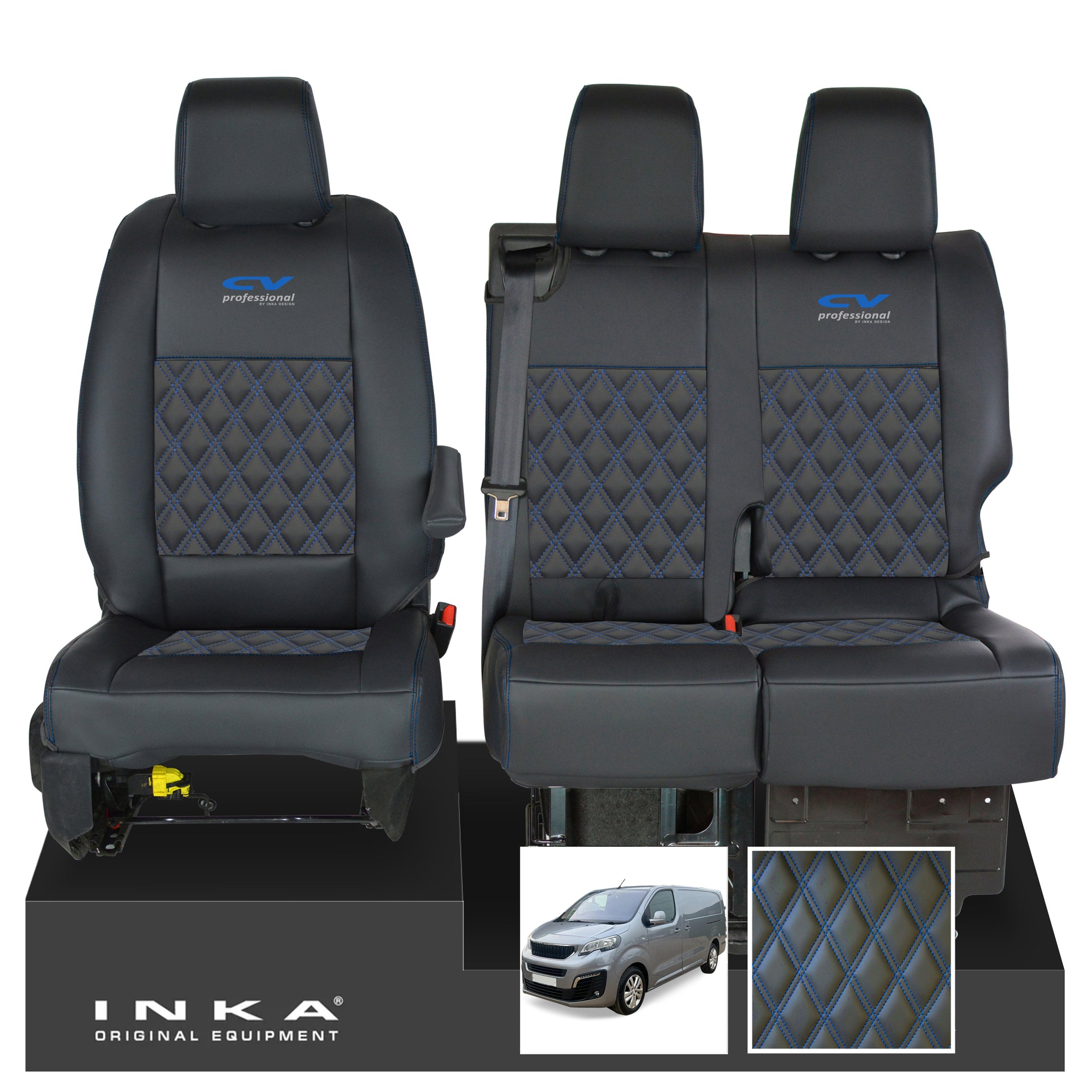 : This Item Can Be returnedPEUGEOT EXPERT-Model Year 2016 Onwards - PERFORMA Leatherette Second Skin - Front 1+2 Tailored Seat Covers-With Headrests & Armrests - Performa Center Panel With Double Diamond Bentley Stitch - Smooth Black Vinyl Outers & Decorative Stitch - With CV PROFESSIONAL EMB On Two Outer Seats ( Choice of 7 Colours )