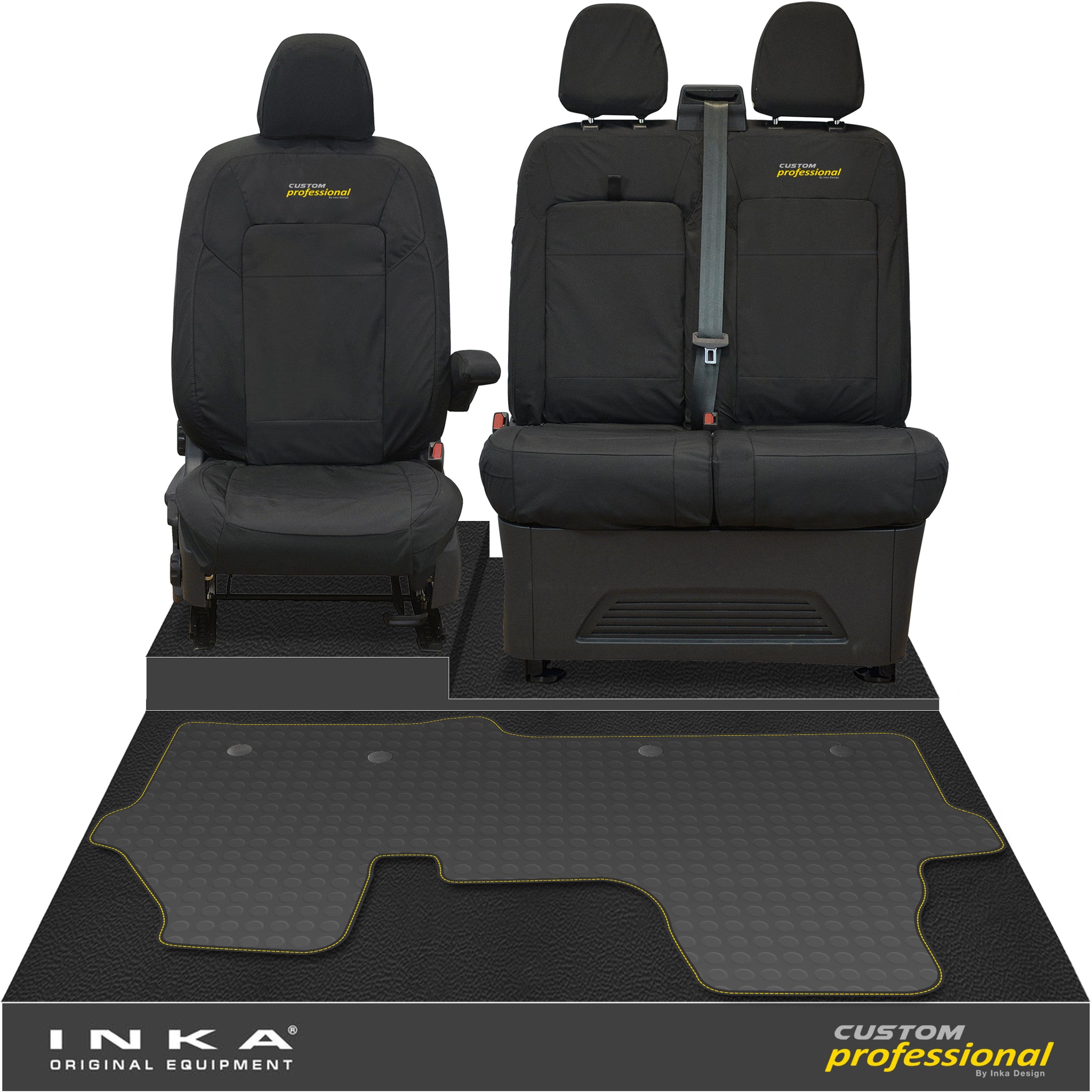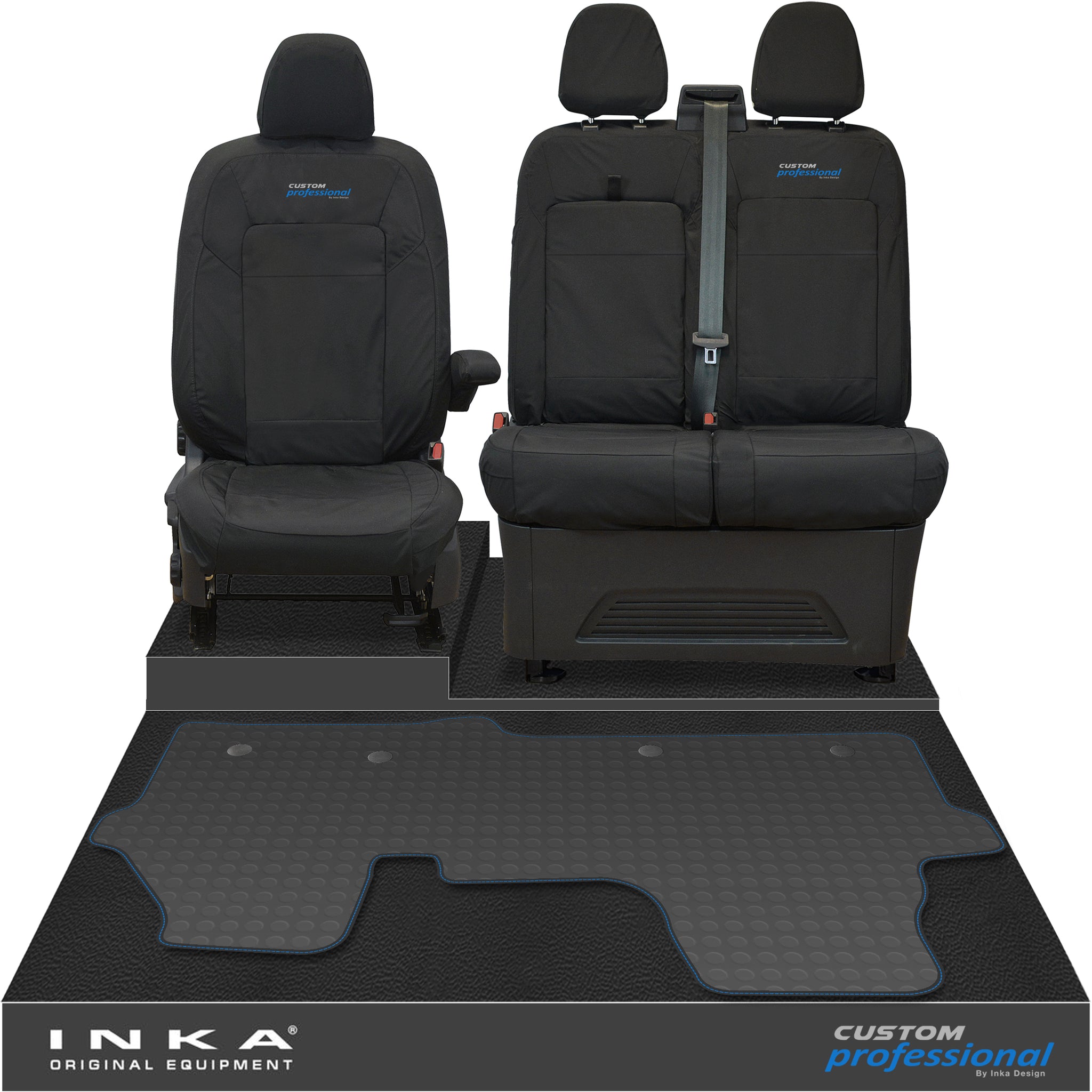 : This Item Can Be returnedThe All New Ford Transit Custom INKA Front 1+2 Tailored Waterproof Seat Covers Set Black MK 2 MY-2024+ With Embroidered Logo + Matching Tailored Rubber Floor Mat [Choice of 7 Colours]