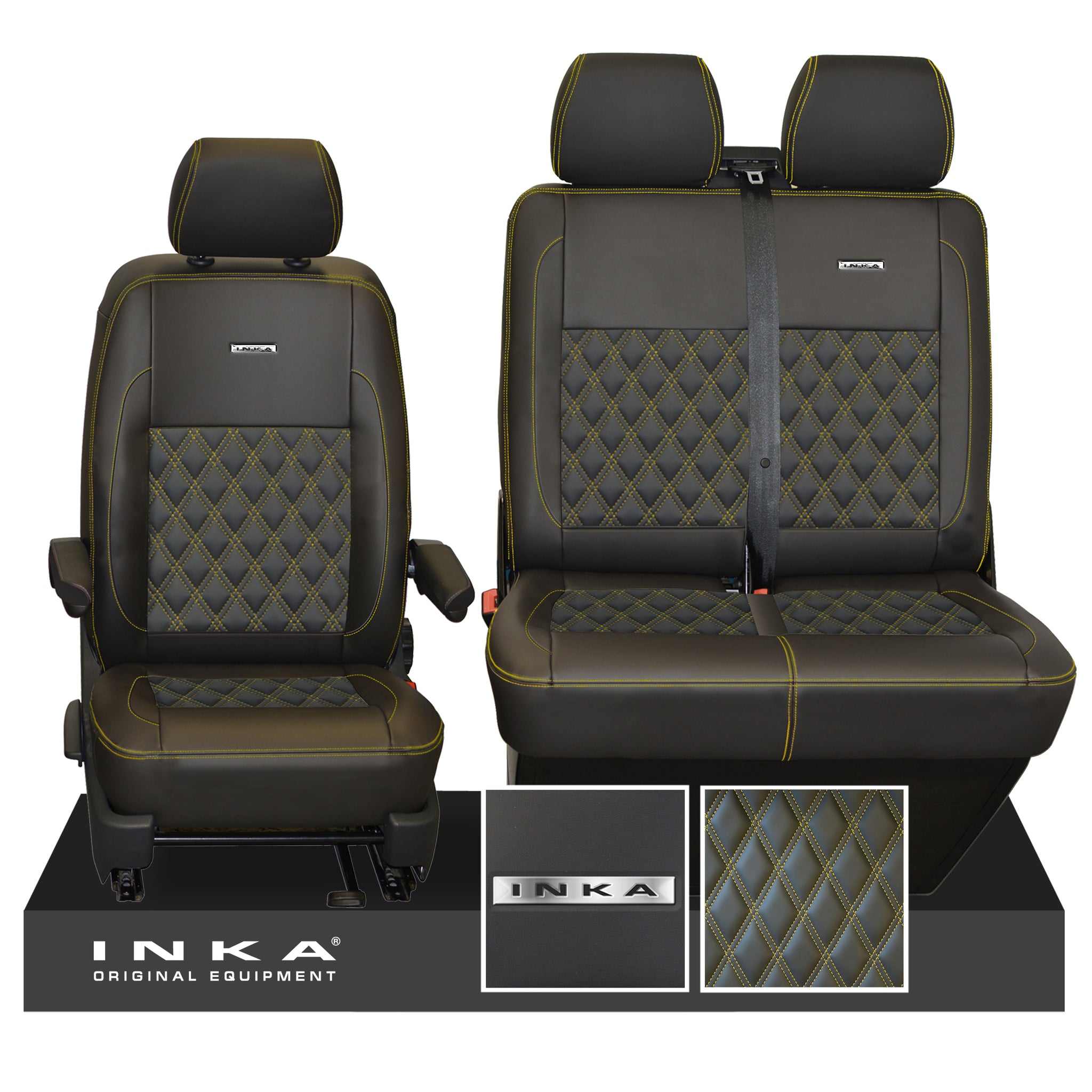 VW Transporter T6.1, T6, T5.1 Front 1+2 INKA Steel Badge Leatherette Tailored Seat Covers Black Fits Panel Van & Kombi